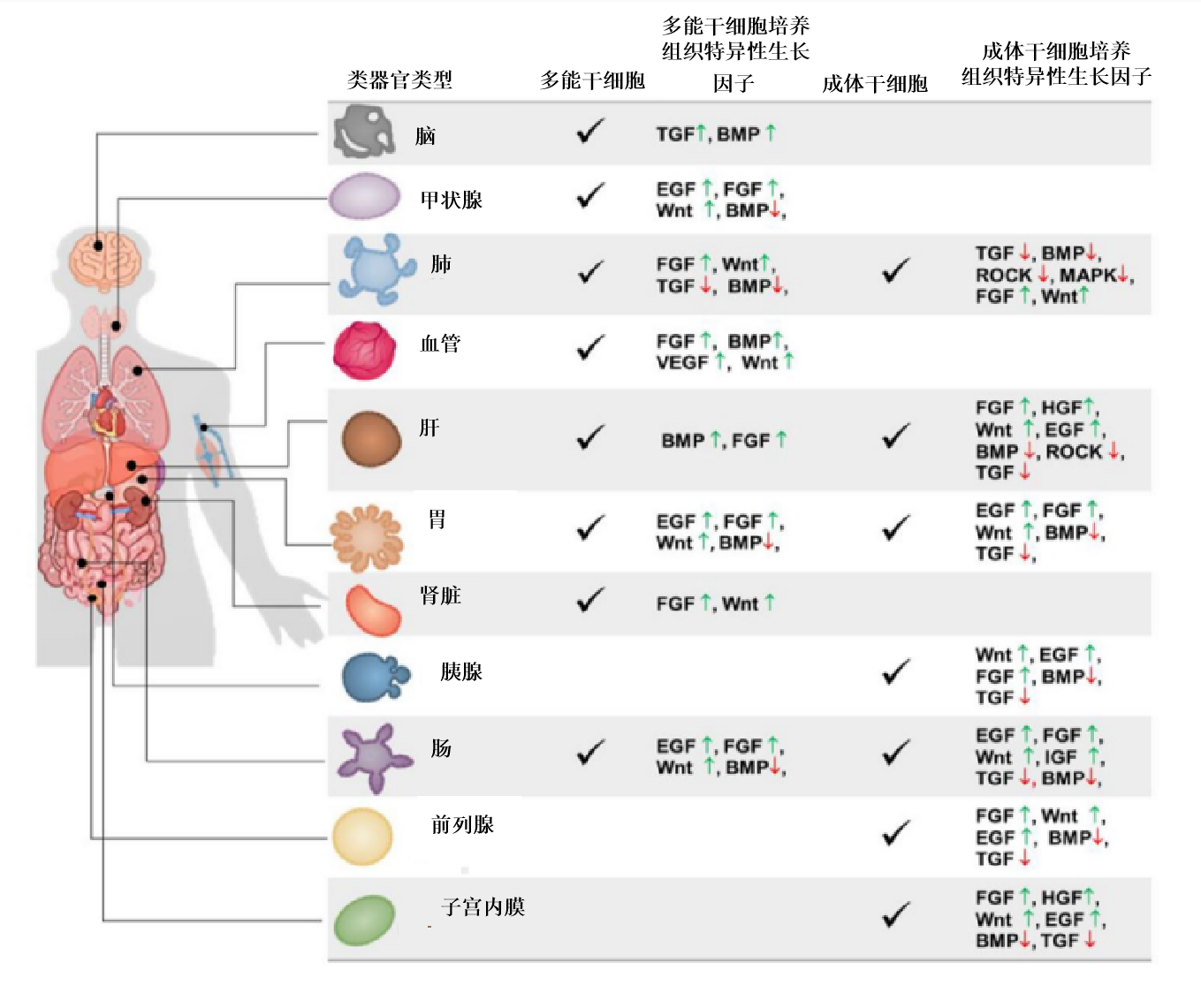 成功建立類器官的關(guān)鍵,除了所需的生物材料基質(zhì)外,生長因子作為細胞培養(yǎng)、增殖及分化所必需的物質(zhì)也必當(dāng)優(yōu)先考慮,從而保證類器官中的干細胞長期生存的能力。通過優(yōu)化培養(yǎng)物生長條件模擬生理組織自我更新或損傷修復(fù)過程中的干細胞巢環(huán)境,如提供基底膜基質(zhì)(即Matrigengel)并添加一系列激動劑(如Wnt和酪氨酸激酶受體)和抑制劑(如骨形態(tài)發(fā)生蛋白/轉(zhuǎn)化生長因子-β)可達到上述目的。不同的生長因子組合也能誘導(dǎo)多能干細胞向不同的類器官細胞分化進而獲得我們需要的類器官類型(圖1),同時不同的細胞因子也是培養(yǎng)不同種類的類器官的關(guān)鍵物質(zhì)(圖2)。