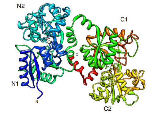 乳鐵蛋白是一個由約700個氨基酸組成的80kDa糖基化蛋白,在物種間具有高度同源性。乳鐵蛋白擁有兩個對稱的同源球狀域:N-環(huán)和C-環(huán);N-環(huán)對應(yīng)于肽鏈中的第1-333個氨基酸殘基,而C-環(huán)與第345-692個氨基酸殘基對應(yīng),這兩個域的兩端由一段短鏈α-螺旋相連接。每個環(huán)有兩個子域(亞域):N1、N2和C1、C2 組成,并分別包含一個鐵結(jié)合位點(diǎn)和一個糖基化位點(diǎn) [1]。