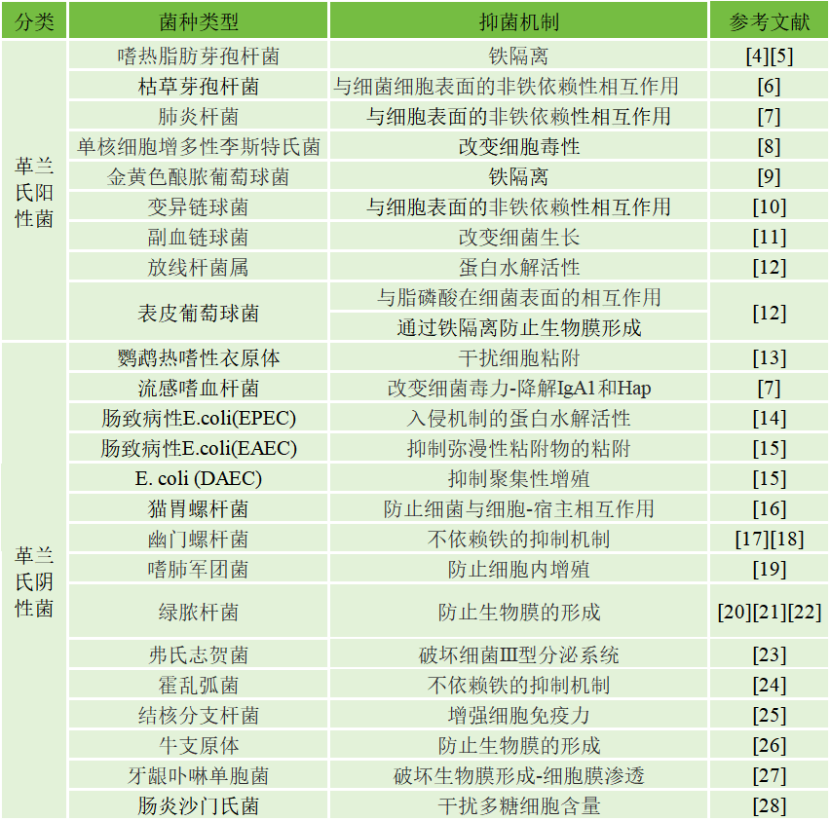 大量研究者研究了乳鐵蛋白對于革蘭氏陽性菌(G+)和革蘭氏陰性菌(G-)在體內(nèi)和體外的抑菌性能和機(jī)制,簡單匯總?cè)缦拢?/p>
